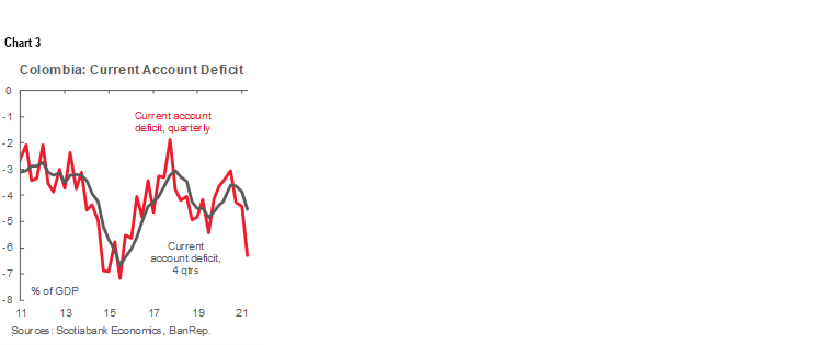 On Wednesday, September 1, the Central Bank, BanRep released Q2-2021 current account data, showing a deficit of USD 4.64 bn in Q2-2021, equivalent to 6.3% of GDP (chart 3), and significantly higher from the earlier USD 3.1 bn in Q4-2020; and USD 3.63 bn in Q1-2021. A wider trade deficit and relatively steady net outflows in the income account explained the much higher overall current account deficit as domestic economic activity recovered despite nationwide strikes in May.