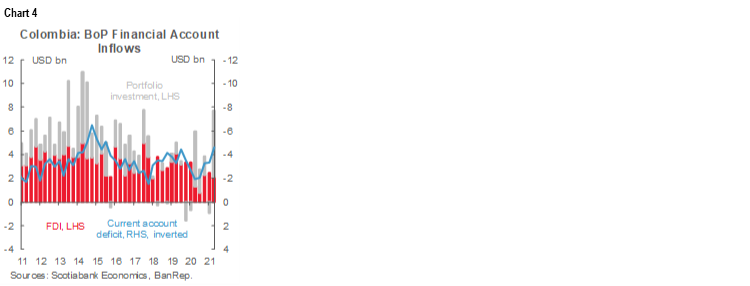 Portfolio investment with net inflows of USD 5.8 bn was the main source of financing in Q2-2021 on the back of strong appetite from offshore agents to COLTES (between March and June offshore agents bought ~USD 2.8bn of COLTES and now represent 25% of TES holders). Net FDI (net USD 2.1 bn on inflows of USD 1.1 bn, chart 4), meanwhile, showed a fall of 34% y/y and 32% q/q, amid the social unrest and the third wave of COVID-19 that resulted in some delays in investment decisions, although we expect this to recover over time. Remittances remain very strong and showed net inflows of USD 2.6 bn on the back of higher inflows from the United States due to social expenditure programs in that country, which temporarily increased immigrants’ disposable income.