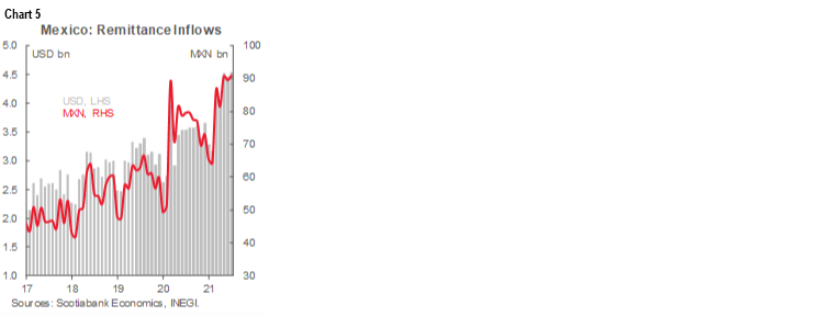 - Mexico: Survey of expectations sees higher inflation, median policy rate of 5.00% by year-end; remittances hit new record