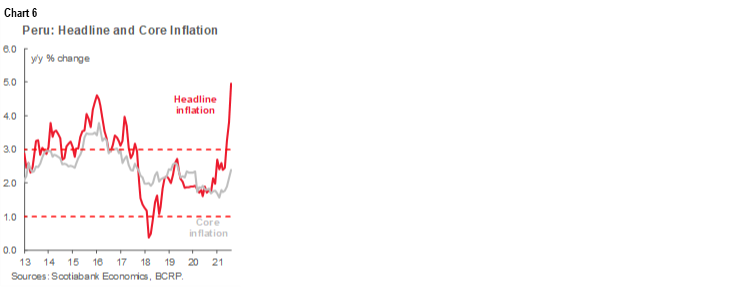 The recent spike in inflation mainly reflects an increase in costs. Wholesale inflation, linked to production costs, was up 12% y/y, the highest pace in 26 years. These cost factors include both contagion from globally rising raw materials and energy prices, and a domestically determined sharp weakening of the PEN against the dollar linked to political uncertainty. These sources of pressure on prices have not fed through fully locally and are likely to persist for the rest of this year and into the next.