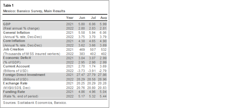 According to the Central Bank’s (Banxico) August Expectations Survey, conducted between August 20–30, the expected headline inflation rate for end-2021 increased for the eighth consecutive month, this time from 5.94% to 6.06%, moving even further away from the central bank's 3.0% target (to be reached by Q1-2023) and it’s forecast of 5.70%. Expected core inflation jumped from 4.65% y/y to 4.90% y/y, possibly influenced by changes in consumption dynamics favoring essential goods such as food and non-food commodities (table 1).