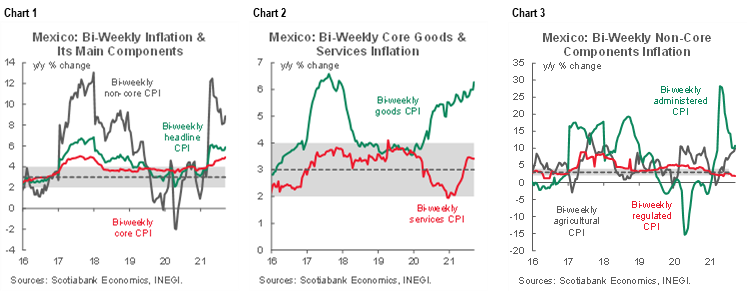 According to data released by statistical agency (INEGI), headline inflation accelerated from 0.18% 2w/2w to 0.42% 2w/2w on a sequential basis during the first half of September, well above the Citibanamex Survey of consensus of 0.27%. Non-core inflation led the way, soaring from 0.24% 2w/2w to 0.76% 2w/2w as the effect of price controls on energy and government tariffs dissipated, rising from -0.01% 2w/2w to 0.63% 2w/2w, and food also accelerated strongly, from 0.55% 2w/2w to 0.92% 2w/2w. Core inflation also accelerated from 0.17% 2w/2w to 0.31% 2w/2w, exceeding the consensus of 0.24% 2w/2w, as services rose from 0.07% 2w/2w to 0.17% 2w/2w and merchandise accelerated from 0.28% 2w/2w to 0.41% 2w/2w.