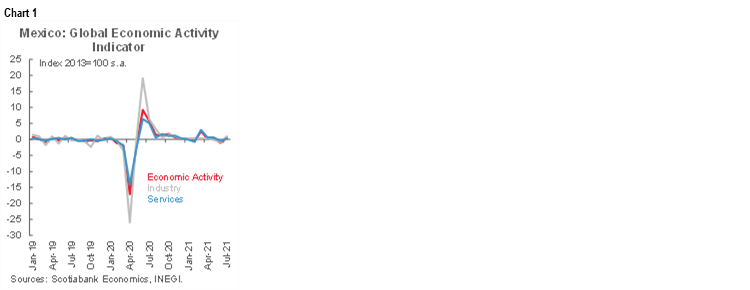 Statistical agency (INEGI) published the monthly GDP proxy (IGAE) for July, showing a continued rebound from the COVID-19 shock, but the strength of the rebound (+0.54% m/m s.a) (chart 1) came up well short of the print expected by consensus (+0.75% m/m sa). Primary activities remain a bright spot (+1.9% m/m s.a), with agriculture being one of the most consistent drivers over the last year. Secondary activities continued to expand at a robust pace (+1.1% m/m), but seem poised to take a hit from a worsening of the auto-sector supply disruption hit as H2–21 plays out. The softest performance was in services (+0.3% m/m sa), which is being weighed down by the new wave of COVID-19, despite the lack of material increases in the stringency of sanitary measures. Based on current COVID-19 infection trends, disruptions to the services sector could worsen in August.