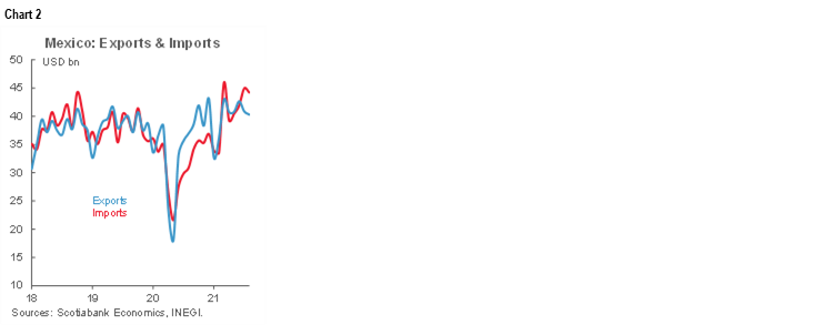 On the merchandise trade front, we also got data for August (also from INEGI) where we saw another big trade deficit print of USD -3.9 bn, following a USD -4.1 bn deficit in July and compared to a consensus deficit of USD -1.1 bn. Our take is that subdued demand was the big driver of the MXN rapid recovery from the initial pandemic-panic driven sell-off, which led to huge trade surpluses. While in the 10 years before the pandemic shock the Mexican monthly trade balance averaged close to a USD 150 mn deficit per month, in June–December of 2020 the Mexican trade balance printed an average surplus of over USD 5 bn per month (chart 2). The first half of this year saw an almost flat trade balance, and the two first months of H2 has seen the balance swing sharply into deficit, driven by very strong imports (in August imports totaled USD 44 bn, versus exports of USD 40 bn) (chart 2, again). The good news, is that investment seems to be gaining some traction, with capital goods imports accounting for close to a third of total imports.