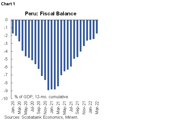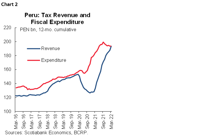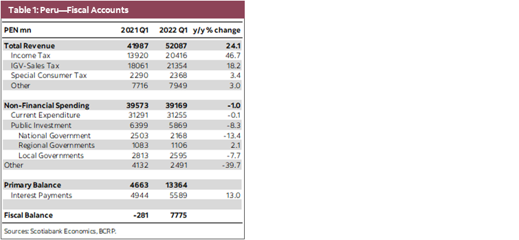 The solid fiscal accounts in Q1 mostly reflected extremely strong revenues. High metal prices represented the bulk of the increase in revenue. But the IGV sales tax (VAT) also contributed, rising a formidable 18% y/y. This impressive performance of the IGV tax has been sustained for some time now, and surpasses what one might expect from jobs growth. One of the drivers may be the lagged impact of government transfers to households and the access to savings that took place up until the end of 2021. Yet even this does not seem to be enough to justify the magnitude of the increase, which we believe is likely to also include a structural change in consumer behaviour towards greater digital payments, which are easier to capture for tax purposes.