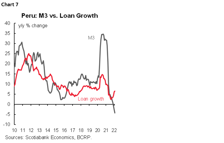 The BCRP statement expresses greater concern about inflationary pressures and cautions that inflation will take longer to reverse. It highlights the central bank’s concern over surging international energy and food prices, exacerbated by the Russian invasion of Ukraine, which have pushed inflation to 6.8% y/y in March. Reflecting these effects, 12-month inflation expectations rose significantly in March, from 3.75% to 4.39%, remaining above the inflation target range for the ninth consecutive month. The rise in inflation expectations exceeded the 50 bps hike in the reference nominal rate, so the real rate fell after five consecutive months of increases, declining from 0.25% to 0.11%. As a result, the monetary policy stance remains expansionary as it is below the 1.5% rate real neutral (chart 6). Year-on-year inflation should begin to decline in July, as base effects kick-in and factors on inflation, such as the FX rate and international prices of energy and commodities, unwind. The BCRP now expects inflation to return to the target in Q2–Q3 2023 in contrast to the March statement, which projected a reversal in Q1–Q2 2023.