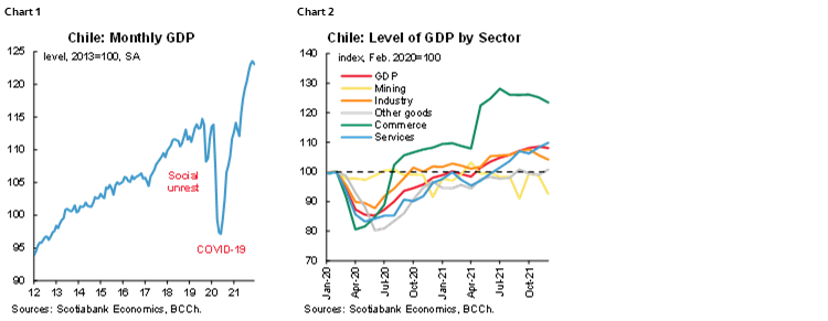 On Tuesday, February 1, the central bank published December’s Imacec index of economic activity, which grew 10.1% y/y, slightly below market expectations (Bloomberg: 10.3%) and Scotiabank’s estimate of 10.5%. Services (business and health) and trade largely explained the y/y economic growth. Goods production also contributed positively to the y/y increase, highlighting the performance of construction.