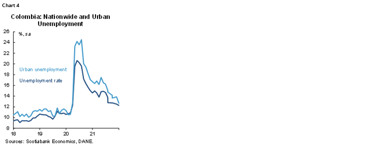 Nationwide unemployment came in at 11.0% in December, while urban unemployment (major 13 cities) was 11.6%. In seasonally adjusted terms, the nationwide unemployment rate was 12.3% in December, decreasing slightly from 12.6% in November, and 12.7% in urban areas as compared to 13.9% in November (chart 4). On average, 2021 nationwide unemployment rate stood at 13.7% and 15.3% for urban areas, decreasing from the previous year’s figures of 15.9% and 18.2%, respectively, but still above of 2019 (pre-pandemic) number of 10.5% and 11.2%, respectively.