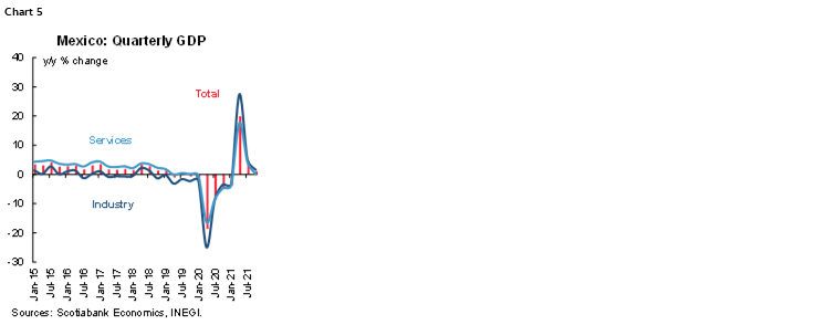 According to INEGI’s preliminary estimate, fourth quarter 2021 GDP came in at 1% y/y, below market expectation of 1.5% y/y (chart 5). For the year as a whole, GDP grew by 5%. On a quarterly basis, Q4 marks the second consecutive decline, -0.1% q/q (-0.4% q/q previously), which would put Mexico in a technical recession if confirmed by the final estimate.