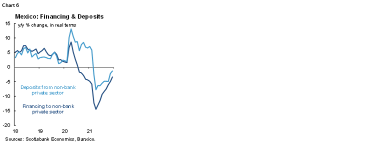 According to Banxico, the decline in bank deposits slowed in real terms from -2.2% y/y in November to -1.3% y/y in December (2021 average -2.8%), as term deposits contracted –8.9% y/y from -10.3% y/y, while demand deposits increased from 2.4% y/y to 2.8% y/y (chart 6). During 2021, deposits were affected by a higher base of comparison and an increase in household spending triggered by an easing of pandemic constraints. However, the recovery in income, supported by remittances (at record highs), attenuated the decline in bank deposits.