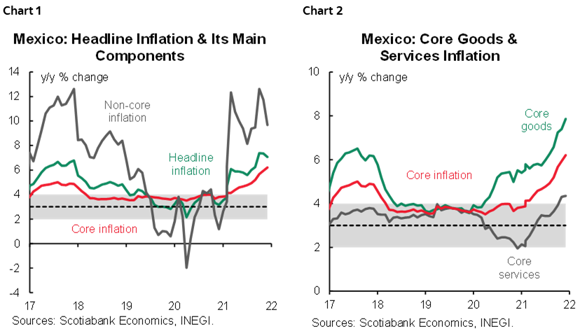 According to INEGI, headline inflation was 7.07% y/y in January, slightly above market expectations (7.01%y/y consensus) and down from last month’s 7.36% y/y (chart 1). Core inflation continued its upward trend, however, rising to 6.21% y/y (from 5.94% y/y a month earlier), the highest rate since October 2001 (chart 2).