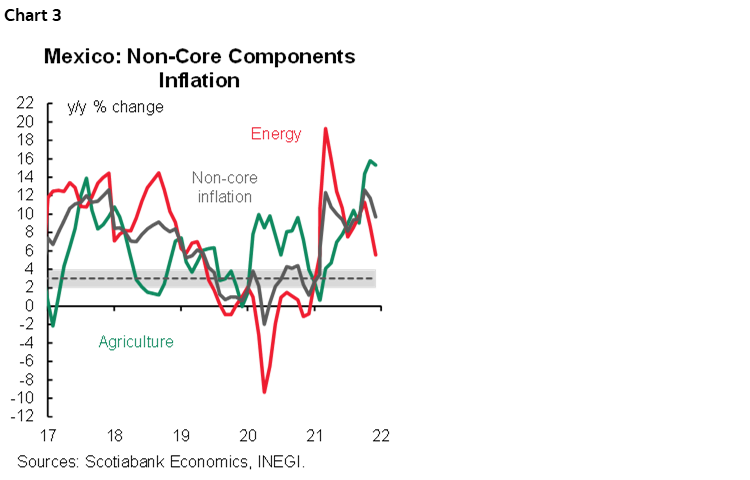 Non-core inflation moderated from 11.74% y/y to 9.68% y/y, as energy price inflation moderated (11.50% y/y versus 6.75% y/y last month) along with fruits and vegetables (21.73% y/y versus 18.44% y/y last month) (chart 3).