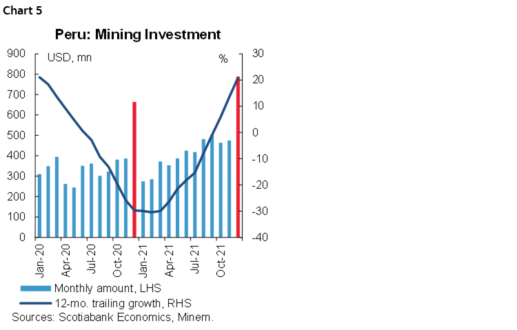 Mining investment increased 18.7% y/y in December, according to official data (chart 5). Investment was driven by Anglo American’s Quellaveco project and the Toromocho expansion project, which are 80% and 66% complete, respectively, with both projects expected to be completed in 2022. By category, investment was driven by “exploration” (+75.7% y/y), as companies increased exploration investment in response to high metals prices, “mining equipment” (+65.1% y/y), “development and preparation” (+53.4% y/y) and “infrastructure” (+42.6% y/y). For the year, investment increased 21.1% in 2021, still below 2019 levels (table 1).