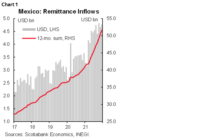 Remittances in December amounted to USD 4.76 bn, 30.4% more than in December 2020 (chart 1). On an annual basis, remittances grew 27.1% and reached an all-time high of USD 51.594 bn, which represents around 4% of GDP. The number of transactions in 2021 rose 14.3% y/y, while the average amount per transaction increased 11.1% y/y. These results can be explained by several factors: the increased difficulties for Mexican nationals abroad to visit Mexico may have caused a substitution effect; the perceived deterioration in the domestic economy; and, fiscal stimulus during most of 2020 and 2021 and the recovery of the US labour market. Going forward, we expect a slowdown in the US economy, which could lead to a moderation in remittances growth. However, remittances will continue to support private consumption.