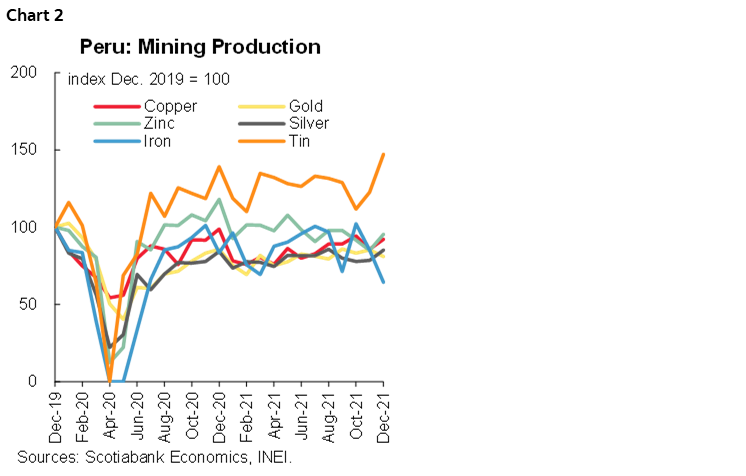In December, economic activity continued the slowdown shown throughout the fourth quarter of 2021, in line with Scotiabank’s forecast. Based on advance indicators released by the INEI, GDP would have posted a growth of around 2% y/y in December, with an accumulated expansion in 2021 consistent with our forecast of 13.3%. The data show a drop in primary sectors in December, with the mining sector (-7.1%) affected by the drop in the production of iron (chart 2). The fishing sector (-12.6%) was affected by the lower anchovy catch attributable to the reduction of the quota for the second fishing season. Construction activity dropped for the third consecutive month, in line with the projected decline in private investment as a result of the deterioration of business expectations stemming from the high political noise. Economic activity in the commerce and services sectors increased but at a lower rate than that posted in November due to a base effect, since December 2020 was the first post-pandemic month in which GDP grew.
