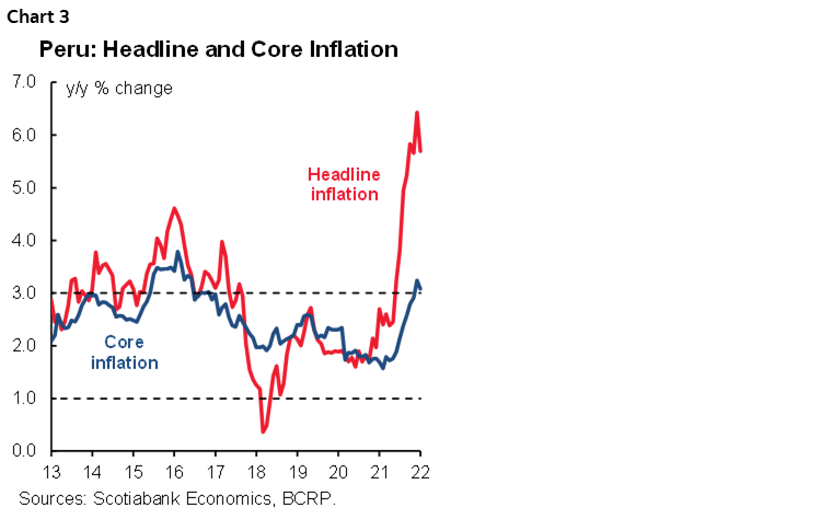 Peru’s inflation was 0.04% m/m in January, the lowest increase in prices since April 2021 (-0.10%) and the lowest rate for the month of January since 2012 (-0.10%). Inflation took a breather on a year-over-year basis, coming in at 5.7%, down from 6.4% in December. This outcome is below the Bloomberg consensus (5.99%), though close to Scotiabank’s forecast (5.8%). This marks the eighth consecutive month that inflation exceeded the upper limit of the central bank’s target range (between 1% and 3%) and with price pressures still far from showing signs of converging towards the target will put pressure on the central bank to continue raising its reference rate in February (chart 3).