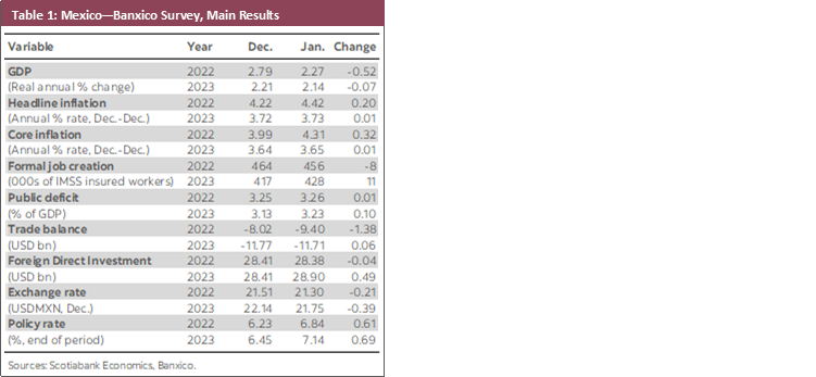 Banxico’s survey of expectations again revised upward inflation expectations, exceeding the central bank’s inflation goal, while lowering growth forecasts for 2022 and 2023 (table 1). Inflation expectations for 2022 rose to 4.42% y/y from 4.22% y/y in the previous estimate. While we expect the effects of tighter monetary policy to become more visible in the second quarter of 2022, we still expect inflation to close the year above target (Scotiabank 4.50% y/y). For 2023, the average response increased marginally, from 3.72% y/y to 3.73% y/y, although responses were in a lower range of variability. Core inflation also increased for 2022 to 4.31% y/y (3.99% y/y previously) and was effectively unchanged for 2023 (3.65% y/y versus 3.64% y/y previously).