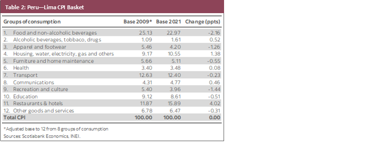 The statistical agency (INEI) announced a new base period (December 2021) and updated CPI basket for inflation starting in 2021. There had been no change in the base year since 2009 (12 years—well above the five years suggested by international recommendations). This update has taken three years of review and advice from the IMF and includes an increase in products that make up the basket (+54, to 586 products) as well as greater coverage of points of sale from which price data is collected. Table 2 shows the main changes in the weights between 2009 and 2021. The food and non-alcoholic beverages group, with the greatest weight in the basket, lost 2.16 ppts, which is offset by the increase in the weight in restaurants and hotels and housing, water, electricity and gas. Changes to the rest of the weights are minor.