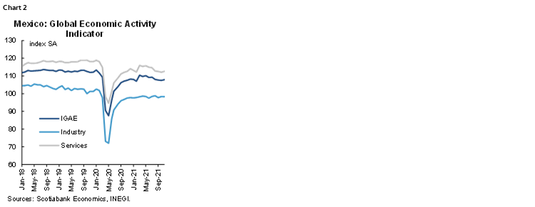 According to INEGI data released on January 25, November’s IGAE index of economic activity rose 1.66% y/y, a positive surprise to the market’s expected 1% y/y increase. On a monthly seasonally adjusted basis, the index rebounded 0.3% m/m in November, breaking a three-month negative trend (chart 2). Industry fell marginally -0.1% m/m, with construction registering its third consecutive decline at -0.6% m/m and manufacturing slowing from 1.8% m/m to 0.0% m/m.