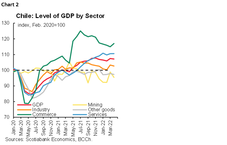 There was a rebound in trade, closely associated with the automotive sector. In seasonally adjusted terms, commercial activity grew 1.8% m/m, standing out as the only sector that showed an increase in April (chart 2). The rebound was explained by a positive performance of the automotive sector, which according to the figures showed by the statistical agency (INE) released yesterday, experienced a 12% y/y increase in sales. Despite this rebound, trade is likely to continue to the slowing trend that began a few months ago, which has been gradual thanks to the support of abundant liquidity in debit and checking accounts.