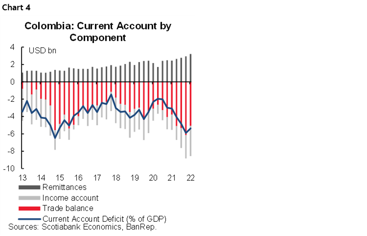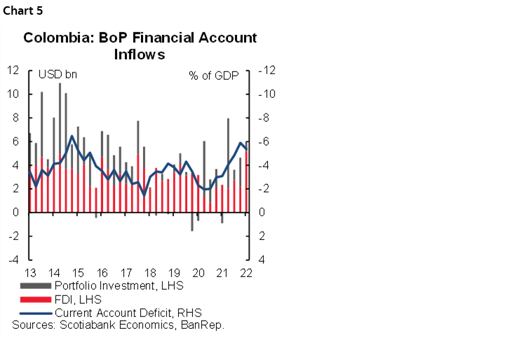 On Wednesday, June 1, the central bank (BanRep) released Q1-2022 current account data showing a quarterly deficit of USD 5.37 bn, equivalent to 6.4% of GDP (chart 3), down somewhat from the Q4-2021 figure but near the 2015 high. Exports benefited from higher commodity prices, while imports remained broadly stable compared with the previous quarter. Remittances helped narrow the deficit, while income account outflows weighed against further declines. As a percentage of the GDP, the deficit fell from 6.8% to 6.4%, reflecting stronger economic activity at the start of 2022.