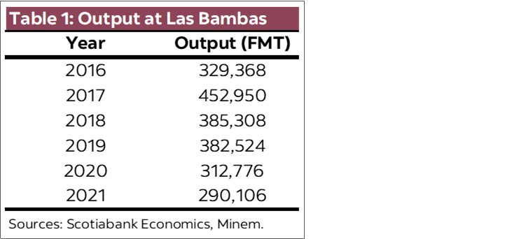 Note also that Las Bambas copper output represents approximately 0.8% of Peru’s GDP. However, this is already factored in our GDP forecast of 2.6% for 2022. Las Bambas production represents 2% of the world's copper supply and around 15% of Peru's copper production.