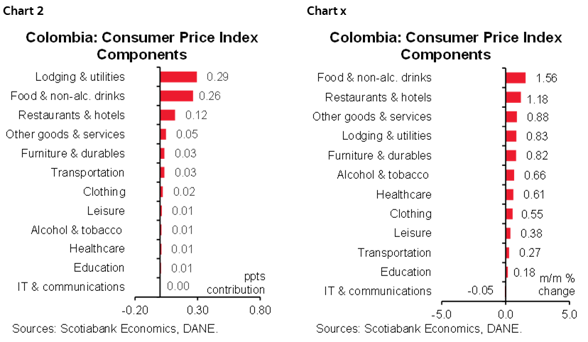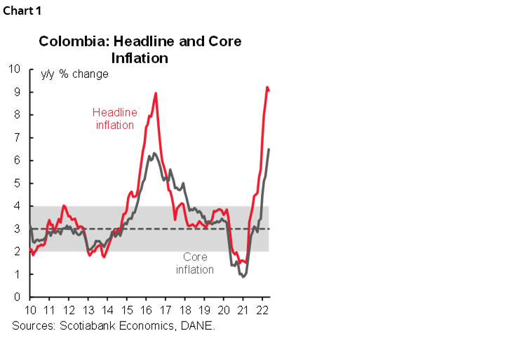 According to DANE data published on Saturday June 4, monthly CPI inflation was 0.84% m/m in May 2022, close to the BanRep’s survey (0.82% m/m) and aligned with Scotiabank Economics’ projection (0.84% m/m). The May inflation reading was almost 2.5 times the average monthly inflation observed since 2016 (0.33% m/m) and brings annual headline inflation to 9.07% y/y, down from 9.23% y/y in April (chart 1). Annual food inflation eased from 26.2% y/y to 21.60% y/y, exhausting the upside effect of the nationwide strike one year ago, as the only element of the CPI basket contributing to the deceleration of inflation on a year-over-year basis.