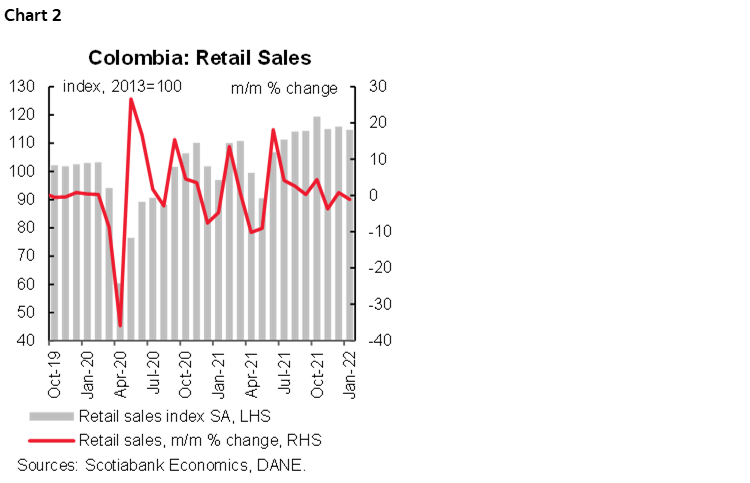 On Tuesday, March 15, Colombia’s statistical agency (DANE) released its monthly survey of economic activity for January, with indicators pointing to a strong expansion as the economic recovery continues. The indicators are subject to base-level effects, however, because the country was in lockdowns in January 2021. DANE also released confidence numbers that showed that businesses are less optimistic owing to the effects of inflation on input prices, while prospects for employment creation remain cloudy. For now, we affirm our GDP growth forecast of 4.5% in 2022, reflecting the reopening of the economy and the transition to less expansive monetary and fiscal policies.