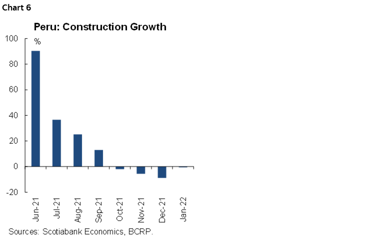 January GDP growth came in at 2.9% y/y, according to the National Statistic Institute (Table 2). This is not the type of growth that Peru could be showing, given strong metal prices and robust macro balances, but it is also not as bad as feared, considering political turbulence and the suboptimal business environment. January’s GDP represented a 1.4% m/m increase over December, and compares well, in year-on-year terms, with December’s 1.7% y/y growth (chart 5).