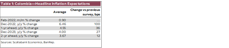 Tuesday, March 15, the central bank, BanRep, published its monthly survey of economic expectations which shows expectations for end-2022 increased by 100 bp following the strong upside surprise in February’s inflation. Inflation expectations for December 2023 are close to the target range ceiling (4%), pointing again to further indexation effects down the road, an unwelcome result for the central bank. At Scotiabank Economics, we view higher inflation coming mainly from a supply shock, which should reverse in 2023, leading us to expect lower inflation by the end of the next year.