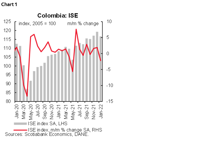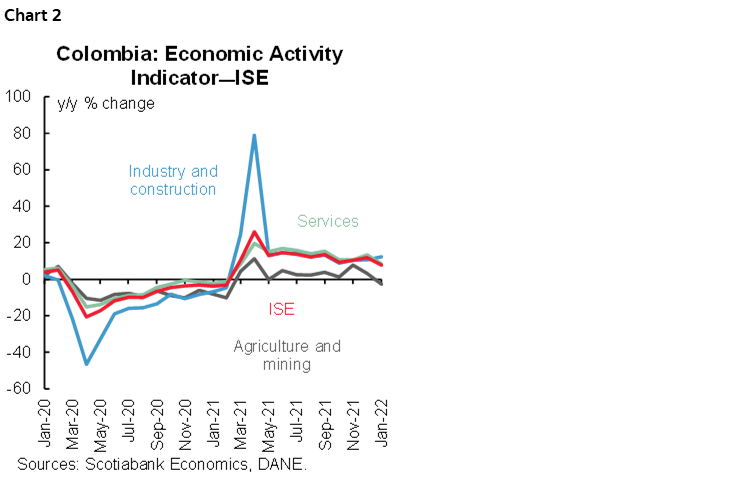 On Friday, March 18, the Colombian Statistical Agency (DANE) released the Economic Activity Indicator (ISE) for January 2022, with the key GDP proxy rising 7.8% y/y, well below the Bloomberg market consensus of 10.4% y/y. Indicators were mixed in January, as strong increases in the services sector were partially offset by negative contributions from agricultural and the financial sector.