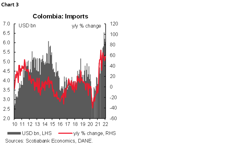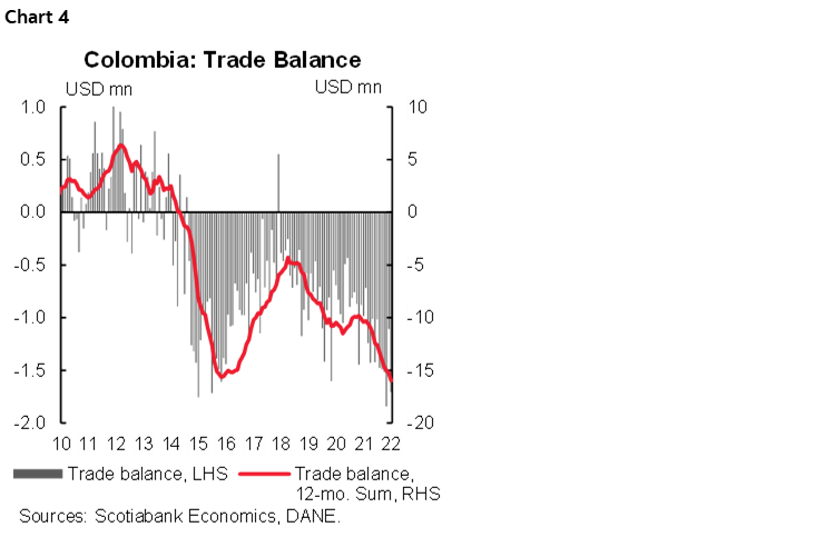January import data, released by DANE on Friday, March 18, came in at USD 6.05 bn (CIF terms), expanding by 58.3% y/y (chart 3), close to the historical high reached in November (USD 6.55 bn). The monthly trade deficit stood at USD 1.7 bn, one of the largest monthly deficits since 2015, showing that the external deficit remains a challenge in 2022.