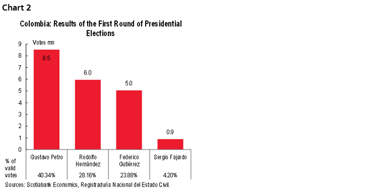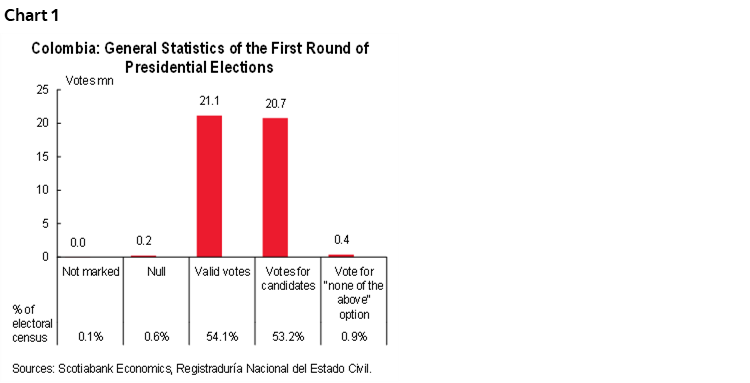 Colombia held the first round of presidential elections on May 29 and with 99.82% of votes counted, the turnout was 54.8% (21.39 million votes, chart 1), slightly above the 54.22% level observed in the 2018 presidential election 54.22% (19.64 million). The votes required to win the presidency in the first round was thus 10.70 million votes.
