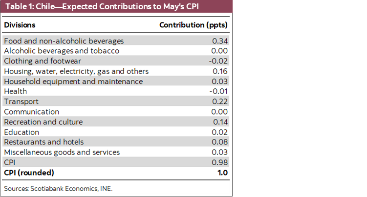 CHILE: WE PROJECT MAY’S CPI AT 0.98% M/M (11.3% Y/Y)