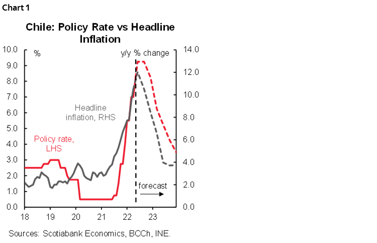 On Thursday, May 5, the central bank (BCCh) hiked the monetary policy rate by 125 basis points (bps), to 8.25%, surprising both market and our expectations. Contrary to our view that caution and lower global growth would likely constrain the increase, the bias of the statement does not seem particularly neutral, and given the size of the increase, the benchmark rate is unlikely to remain at this level. In fact, the BCCh statement makes for a hawkish read, particularly in pointing out that all the recent international and national data are inflationary and the discussion of the board's decision to place the policy rate in the upper part of the rate corridor revealed a few weeks ago in the March Monetary Policy Report. We see a central bank very concerned about local inflation and inflation expectations, and we reassess the terminal rate of this policy cycle towards 9.25% (chart 1).
