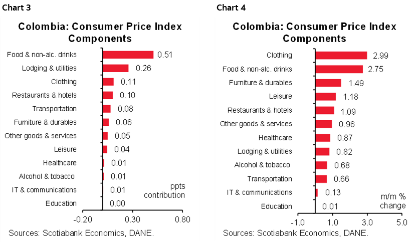 Monthly CPI inflation was 1.25% m/m in April 2022, according to DANE data published on Thursday, May 5, well above the BanRep’s survey (0.78% m/m) and Scotiabank Economics’ projection (1.07% m/m). April’s inflation was almost three times the average monthly inflation observed since 2016 (0.45% m/m) and brings annual headline inflation to the highest level since mid-2000 at 9.23% y/y, up from 8.53% y/y in March (chart 2), and well above BanRep’s target range (2%–4%) for the 19th month in a row. Annual food inflation is at its highest level in recent history at 26.2%.