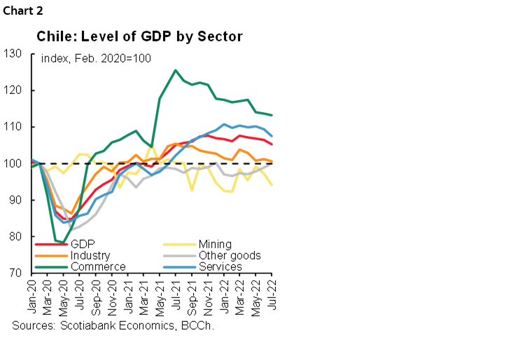 Public investment continues to lag. July's data shows that public spending on investment fell by 16.2% y/y. With this, budget execution reached 35.3% so far this year, reflecting delays in the execution of projects from material shortages and cost increases affecting road projects and public work projects, as well as projects in the housing, health and education sectors. That said, the construction sector posted a positive performance in the Imacec (+1.1% m/m), probably as a result of government efforts to expedite projects.