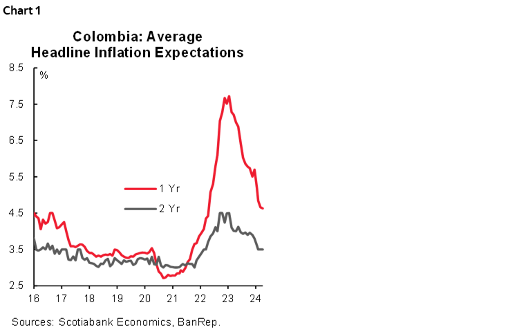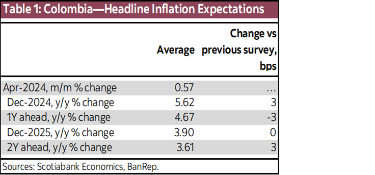The Central Bank (BanRep) released April’s economist’s expectation survey. Inflation expectations were stable this time; for Dec-2024 and Dec-2025, expectations are at 5.62% and 3.90%, respectively. The inflation expectation for the 2-year horizon (April 2026) increased only by 3bps to 3.61%. In the short-term, the inflation expectation for April is at 0.57% m/m, which could take the annual inflation to 7.14% from the current 7.36%. Scotiabank Colpatria’s projection is 0.59% m/m, and 7.16% y/y. During March, the main contributor to inflation is expected to be the lodging and utilities group, which is similar to previous months. On the other side, tradable goods are expected to continue showing a disinflationary mood. Regarding food prices, we expect moderate positive monthly inflation. However, the annual inflation is expected to rebound as the statistical base of April 2023 was negative.