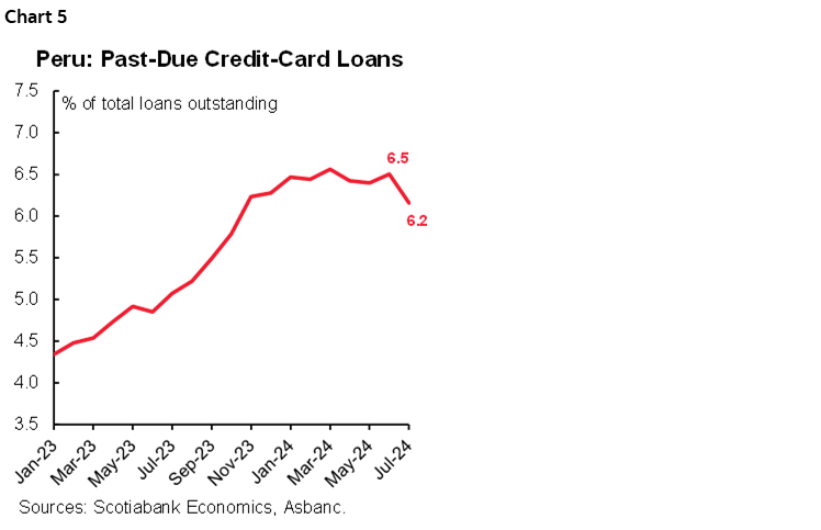 As households improve their balance sheets, past-due loan (PDL) levels should also decline. The information for July is just coming out, but so far we know that credit card PDLs fell to 6.2% of total credit card loans in July, after having fluctuated around 6.5% during most of 2024 (chart 5). This decline should continue.