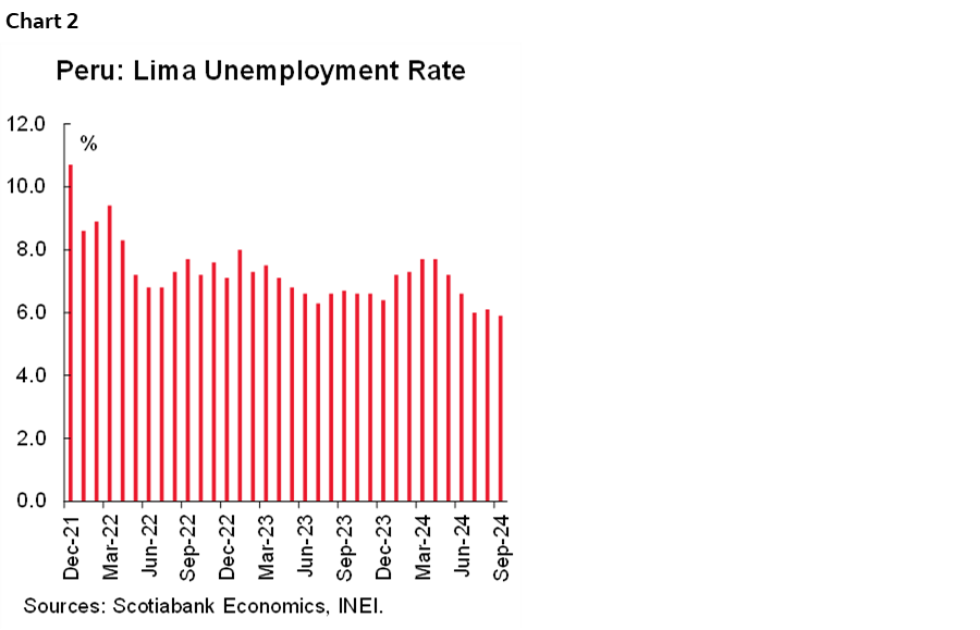The second factor is a strengthening labour market. Jobs growth was 5.3% for Lima in the August–October period. This was the highest three-month register in two years. Equally impressive, the unemployment rate for Lima fell to 5.7%, down from 5.9% in September, and the lowest level since at least 2018 (chart 2). Of course, the inverse is also true. Adequately employed workers represented 57.8% of the labour market in October, the lowest figure since pre-Covid 2019 (Peru divides the labour market in adequately employed, unemployed and underemployed).