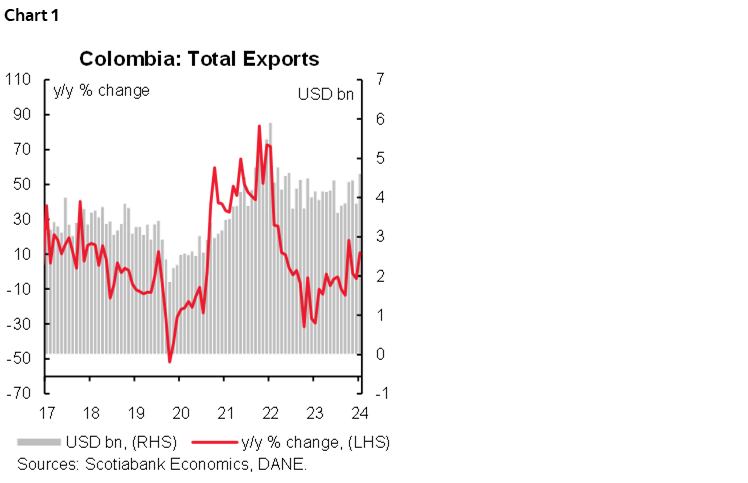 DANE published export data on Tuesday, September 3rd. Monthly exports in July stood at USD $4.82 billion FOB, registering an increase of 10.8% compared to July 2023 (chart 1), the second largest increase since October 2022, showing growth in traditional and non-traditional exports. Compared to the previous month, exports showed a growth of 19.7%, being the largest month-on-month increase since May 2023.