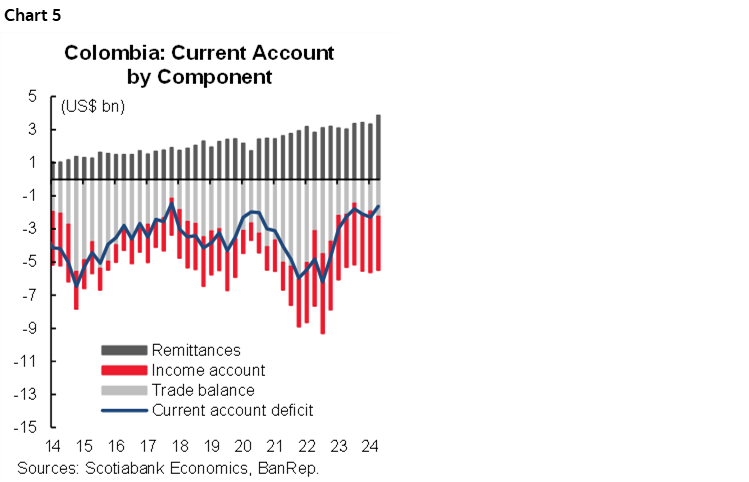 On Monday, September 2nd, the central bank (BanRep) released the Q2-2024 Balance of Payments (BoP). The current account deficit stood at USD $1.63 bn, equivalent to 1.6% of GDP, the narrowest since 2009 (chart 3). During Q2-2024, non-traditional exports related to agricultural products performed better, while imports of goods, especially transport equipment and fuel, decreased further. In the case of services, tourism activities are maintaining the services’ trade deficit at low levels. The income account shows lower outflows as Foreign Direct Investments have lower earnings, especially in the mining, oil, and utilities sectors. In terms of transfers, remittances continued growing and represent 12.2% of the current inflows in the balance of payments. Meanwhile, other transfers were supportive of inflows to Colombia. On the financing side, FDI inflows decreased compared to the previous quarter and posted the lowest inflow since Q4-2021; despite that, net FDI inflows remain the main source of financing for the current account deficit (chart 4). On the other side, capital account inflows improved amid the demand for public debt issuance in the international market.