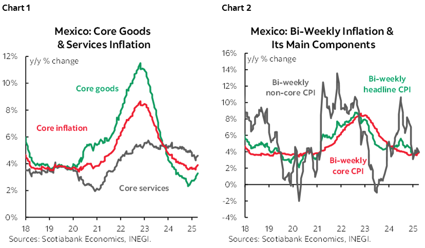 Inflation in the first half of April rose more than expected, reaching 3.96% y/y from 3.93% (vs. 3.86% consensus from Citi Survey). Core inflation increased to 3.90% from 3.72% (vs. 3.79% consensus). Within this, goods rose to 3.28% (3.04% previously), while services at 4.60% (4.45% previously) (chart 1). Non-core inflation stood at 3.95% (4.44% previously), with agricultural products at 4.41% (5.53% previously), and energy and government tariffs at 3.09%. In bi-weekly comparison headline inflation rose to 0.12% (0.21% previously, 0.03% consensus from Citi Survey), core inflation increased by 0.34% (0.18% previously, 0.23% consensus), and non-core inflation fell by -0.59% (0.34% previously) (chart 2). Looking ahead, inflationary risks remain tilted to the upside, highlighting the potential impact of tariff measures between Mexico and the U.S., as well as possible price pass-through due to further depreciation. Additionally, there could be a significant rebound in the non-core component due to climatic events in the coming months.