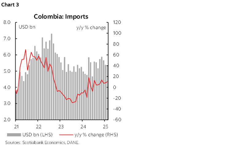 - Imports of capital goods fell by -3.1% y/y. On the positive side, imports of capital goods for agriculture increased 105% y/y, while those in the industrial sector grew by a slight 0.8% y/y. On the negative side, imports of construction materials and transportation equipment decreased by -7.2% and -17.4%, respectively.