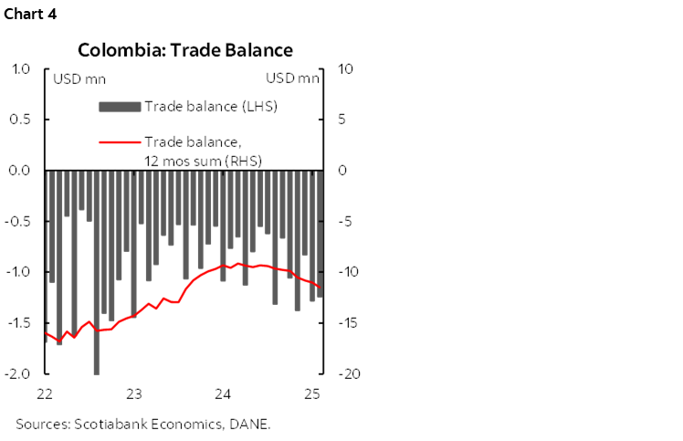 The trade balance stood at US$1.24 billion, widening the deficit by 62.8% compared to February 2024 (US$762.1 million) (chart 4). In February, exports increased at a much slower pace than imports (+0.8% m/m), mainly due to a -22.7% decrease in oil exports and/or less favourable sales prices. The Colombian peso would have no room for appreciation from a real economic perspective if imports maintain their positive trend and exports remain impacted by international prices, as the deficit would continue to widen. Scotiabank Colpatria estimates that the exchange rate will remain between 4,300 and 4,350 pesos.