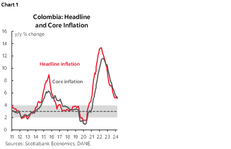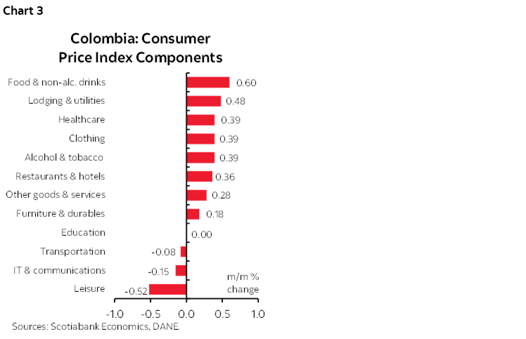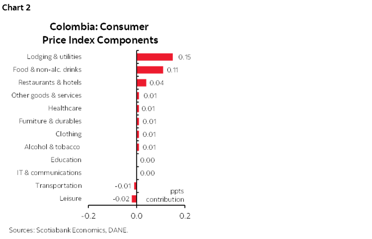 Colombia’s monthly CPI inflation rate was 0.32% m/m in May, according to data published by DANE on Monday. The result was below analysts’ expectations in the BanRep survey of 0.38% m/m, as was Scotiabank Colpatria’s forecast. During the month, 9 of the 12 groups had a positive monthly variation, with lodging and utilities, and food contributing the most to the result, accounting for around 80% of total monthly inflation.