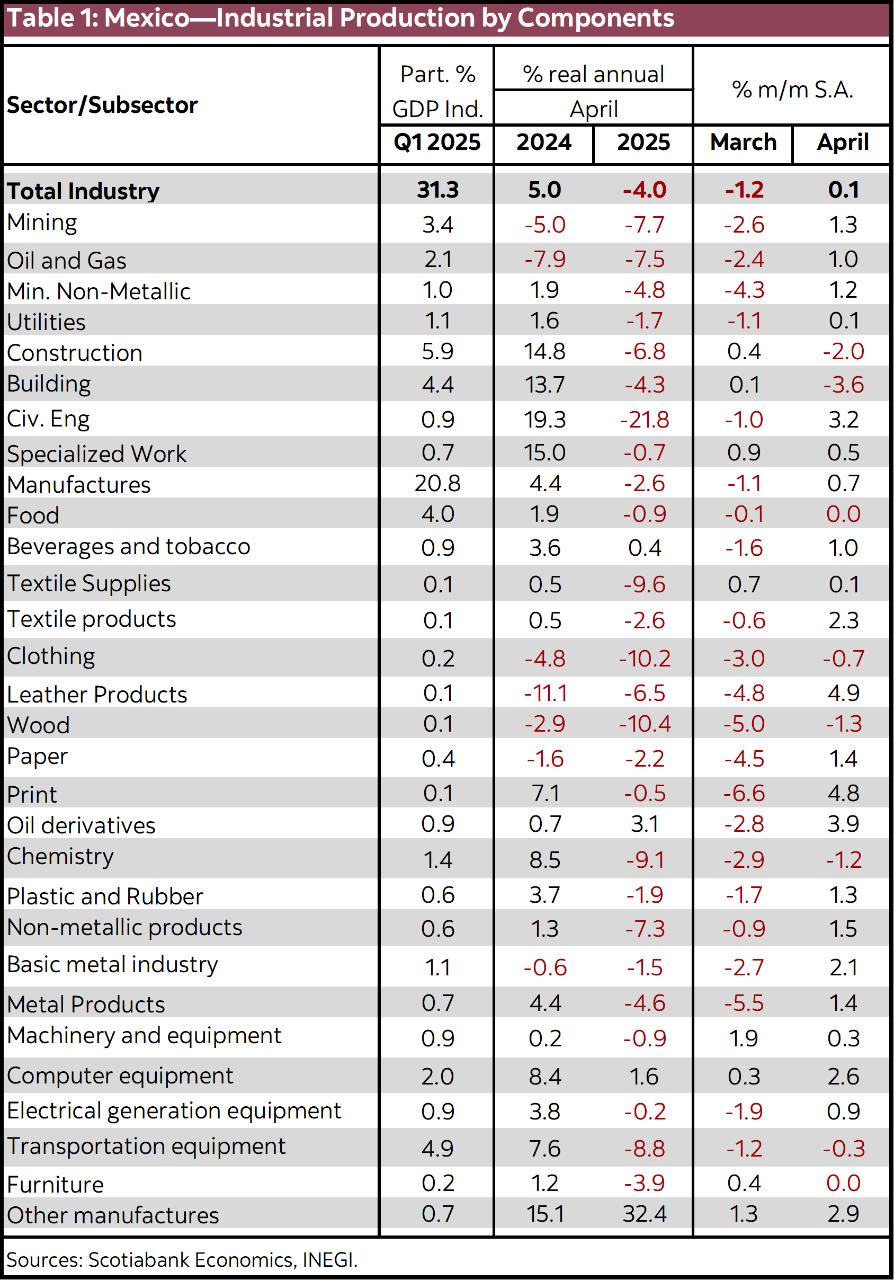 Manufacturing slipped into a 2.6% y/y contraction in April that followed a strong March showing at 3.1%, with negative readings across practically all subsectors. Calendar effects may have played an important role here, however, as the timing of Easter in April of this year compared to March in 2024 resulted in fewer working days reflected in today’s data. Adjusted for working days, Mexican manufacturing expanded by 1.3% in April after a 1.0% drop in March. On a monthly seasonally adjusted basis, transportation output suffered another monthly decline, albeit smaller than in March, of 0.3% m/m from –1.2% m/m. possibly reflecting a small scaling back of operations in response to U.S. tariffs. Machinery manufacturing decelerated but remained in expansionary territory, up 0.3% in April from 2% m/m in March.
