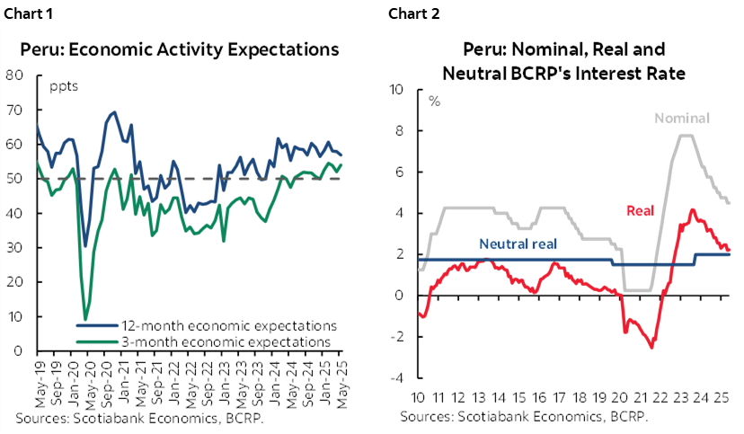 As a result of the decision, the real interest rate rose slightly from 2.21% to 2.23%, due to a decline in 12-month inflation expectations from 2.29% in April to 2.27% in May. The real rate remains above the 2.00% level considered neutral, suggesting that the BCRP still has room for one additional 25 bps cut. However, this will depend on the evolution of international trade tensions and whether local economic expectations continue to deteriorate. We maintain our year-end forecast of 4.50%.