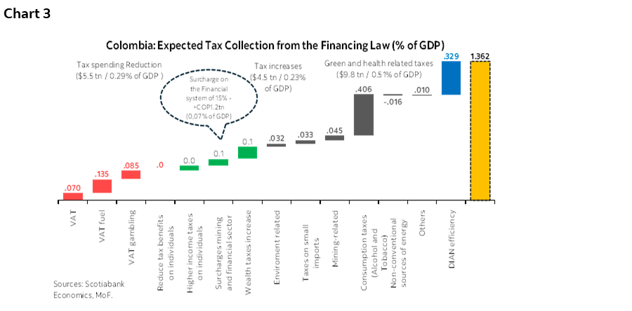 - We believe it will be difficult to garner broad support for the current tax reform proposal. Our base case scenario points toward total rejection, especially since the government has not demonstrated a clear willingness to moderate its spending, however we have to see if Congress wants to negotiate something of the tax reform. Last week, CARF highlighted that there is room to adjust certain expenditures and also noted that even with the approval of the tax reform—estimated to raise 1.4% of GDP—it would still be insufficient to ensure fiscal sustainability. In fact they said Colombia needs to adjust either the spending side or the income side of the fiscal equation by no less than ~ 2.2% of GDP.