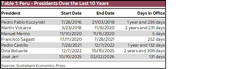 - Yesterday, Peru’s Congress approved a motion of censure against President José Jerí with 75 votes in favour, 24 against, and 3 abstentions. Jerí was Peru’s seventh president in the last ten years, having served for 131 days (table 1).
